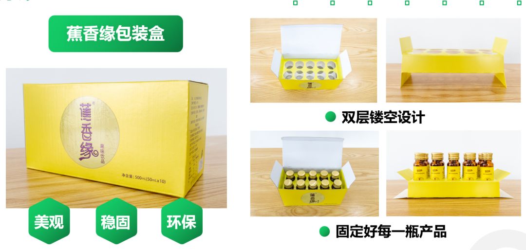 他们再度集思广益,重新开始了选材和设计阶段。在搜索市场上各种包装盒材质后,他们将目光放在了金属、木材和纸质等几种材质上,并开始对每一种材质的优缺点和适用性进行了分析和评估,考虑了它们对产品保护性、美观性、环保性等方面的影响。最终经过多方面的权衡和考量,选择了纸质包装盒作为蕉香缘产品包装盒的材质。